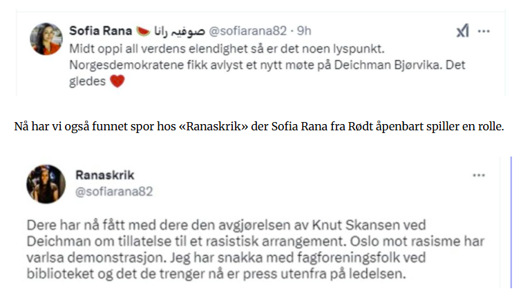 Politikeren er Sofia Rana i Rødt, en kjent antifa-aktivist. Dag Myhre fant dette på nettet om henne knyttet til avlysningen på Deichman, med Myhres kommentar mellom de to skjermdumpene: