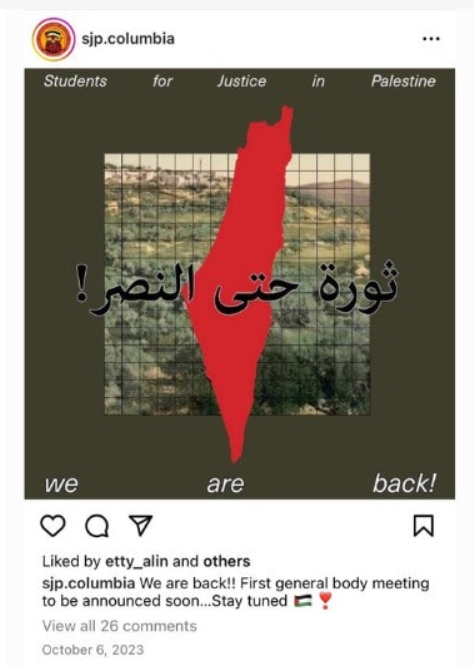 Etter måneder uten aktivitet, skal Columbia SJP ha reaktivert sin Instagram-konto «tre minutter før Hamas begynte sitt angrep 7. oktober», kunngjort et møte og uttalt at støttespillere burde «følge med».