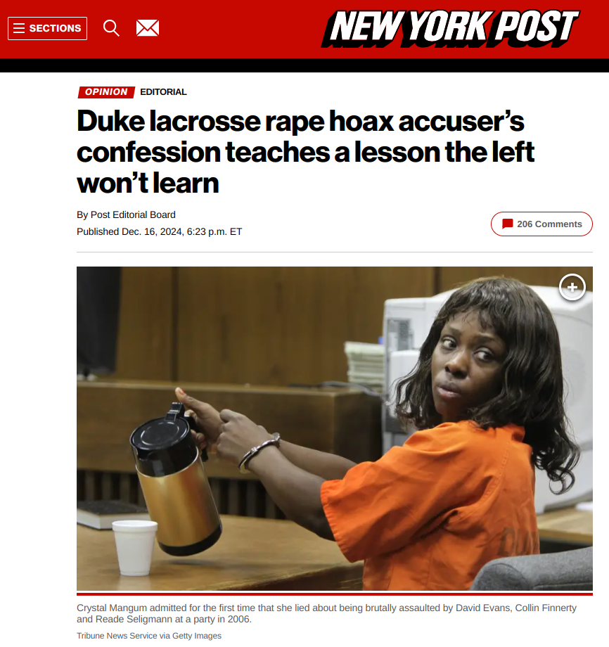 New York Post hadde en god kommentar på redaktørplass rett før jul. Faksimilen viser overskrift og bilde av Crystal Mangum som framsatte voldtektsanklagene.