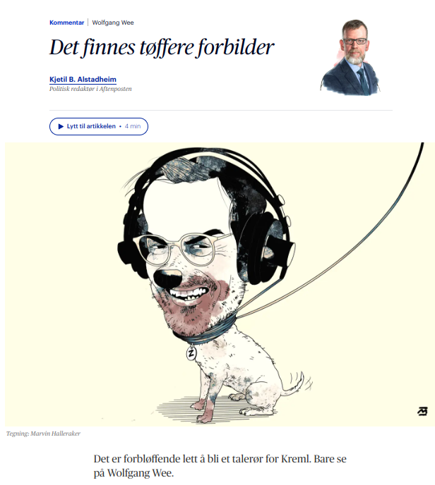 Trykket mot podcast-vert Wolfgang Wee er av det harde slaget, der han framstilles som Putins bikkje i Aftenposten og nyttig idiot av Nettavisens politiske redaktør Erik Stephansen. Faksimilen fra Aftenposten viser illustrasjonen.