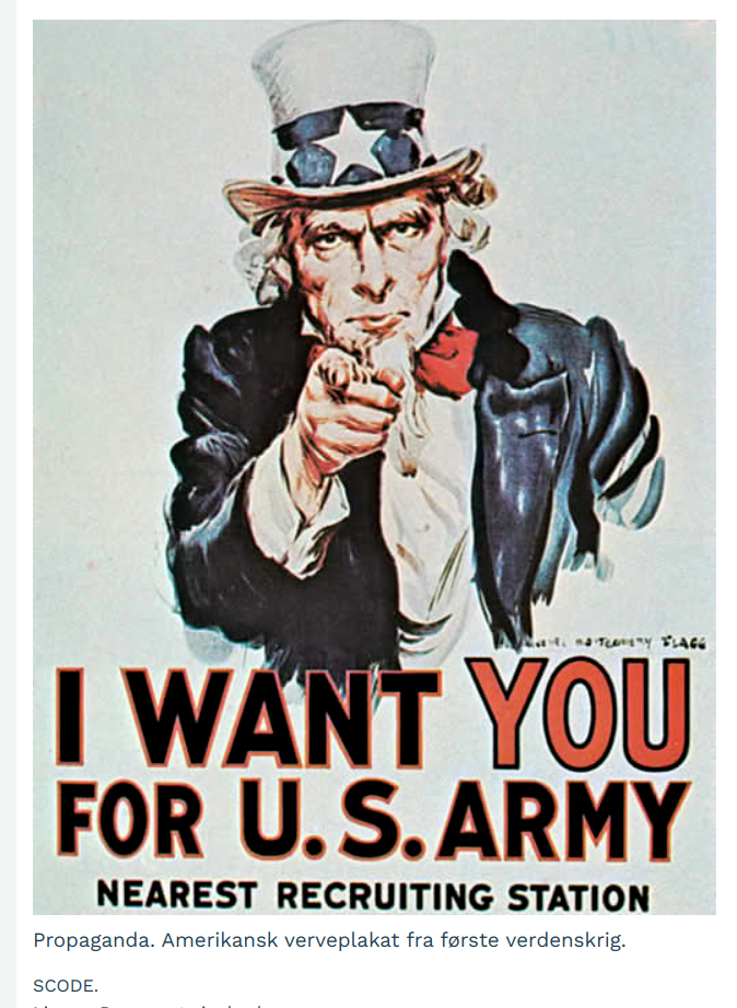 Store norske leksikon (SNL) definerer propaganda som «bevisst manipulering av folks følelser og tanker ved hjelp av sterke virkemidler for å fremme bestemte oppfatninger og handlingsmønstre». I SNL brukes blant annet den amerikanske verveplakaten fra første verdenskrig som et eksempel på propaganda.