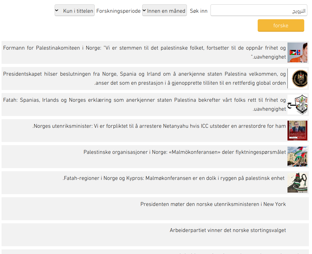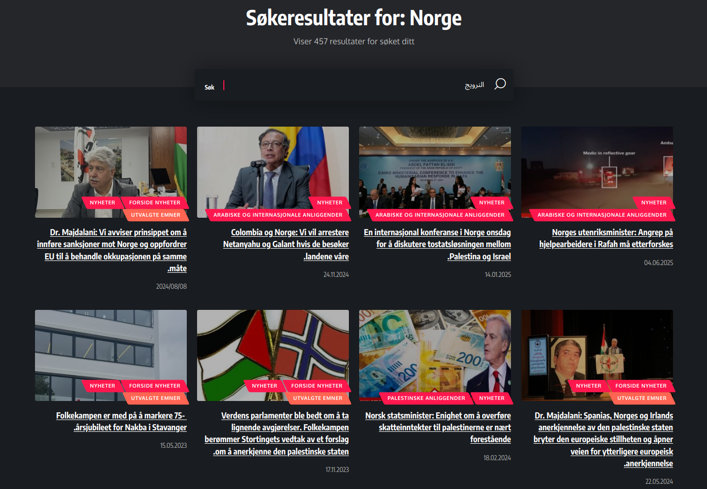 Vi kan tørt konstatere at det ikke mangler på takknemlighet til Norge, både på de offisielle nettsidene til Fatah (søk i søkefeltet med søkeord النرويج, som er arabisk for Norge), slik skjermbildet viser.