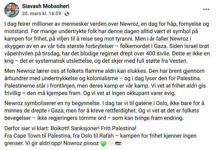 20. mars i år feiret iranere persisk nyttår, og Rødts Mobasheri la ut en post på Facebook.