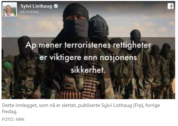 Man kan vite såpass. Man kan ganske enkelt huske tilbake til andre episoder i politikken, eksempelvis da Rødt fremmet mistillitsforslag etter at Sylvi Listhaug publiserte dette på Facebook i 2018 (faksimile NRK)