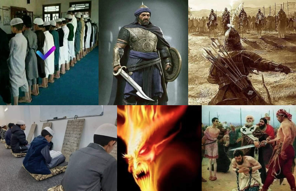 «Hensikten med å bekjempe dem er ikke å få dem til å omfavne islam, men å avskaffe deres herredømme slik at de ikke kan herske over folk. Lederskapet bør kun ligge hos de som følger Den rette vei. Ikke-troende som bor i staten bør leve underordnet den islamske staten. De som ønsker, kan akseptere islam ut av sin egen frie vilje, eller de kan fortsette å betale beskyttelses-skatten (Jizia). Jizia betales av «de beskyttede» (zimmiene) til gjengjeld for sikkerhet og beskyttelse som de er garantert i den islamske staten. Dette er også et symbol på det faktum at de velger å bo der.»