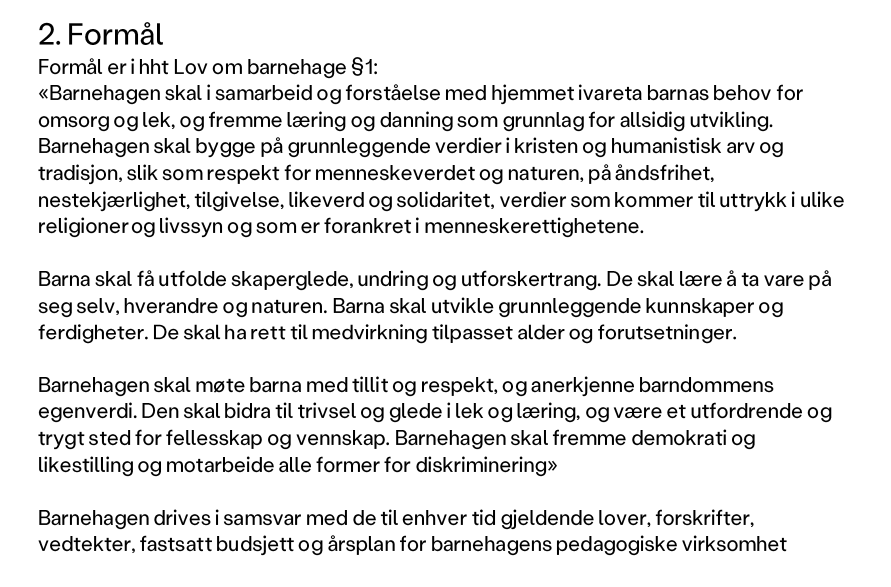 Barnehagen er privat og tilhører som nevnt barnehagekjeden Læringsverkstedet. På barnehagens egne nettsider kan man lese at de ikke har søkt fritak fra lovens formålsparagraf, de har utelukkende gjenngitt barnehagelovens §1. Det finnes faktisk mulighet for private barnehager å søke om fritak – det er hjemlet i §1a, som sier: