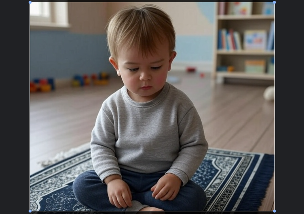 Vi samlet alle de minste barna på gulvet for «undervisning», 2-, 3- og 4-åringer. Undervisningen viste seg etter hvert å være om bønneteppe, islam, og hvordan muslimer går kledd og ber. Barnehagetanten, ung, norsk, men av nord-afrikansk eller arabisk bakgrunn, viser og ber de små barna komme og bøye seg ned på teppet, og forstod de ikke helt med en gang, så «lurte» hun dem i riktig stilling, ved å be dem «lukte» på bønneteppet.