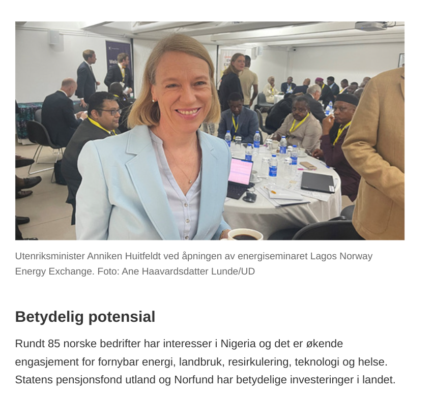 Mens Anniken Huitfeldt (Ap) fremdeles var utenriksminister i 2023, dro hun på solenergireise til den islamske ledelsen i landet. Faksimilen fra regjeringens nettsider viser en glad minister på plass nord i landet, mens kristne slaktes for fote i sør. 17 bestialske terrordrap i døgnet, ifølge statistikken.