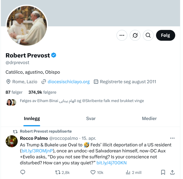 Tar man en kikk på pavens X-konto, er den siste meldingen han har lagt ut en ren kritikk av president Donald Trumps utvisning av kriminelle, illegale migranter.