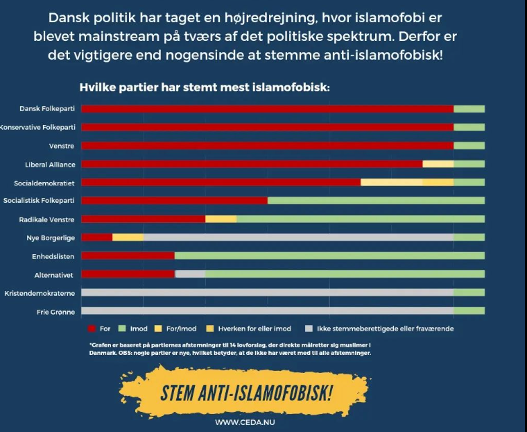 I Danmark har man tilsvarende muslimsk pressgruppen ved nasjonalvalg. For eksempel publiserte For eksempel publiserte Center for Muslimske Rettigheter i Danmark (CEDA) i oppkjøringen til folketingsvalget i 2022 en grafikk med overskriften «Ta et informert valg 1. november», som rangerte partiene basert på graden av «islamofobi». Grafikken var basert på partienes stemmer i 13 avstemninger om lovforslag som burkaforbudet og repatrieringsloven.