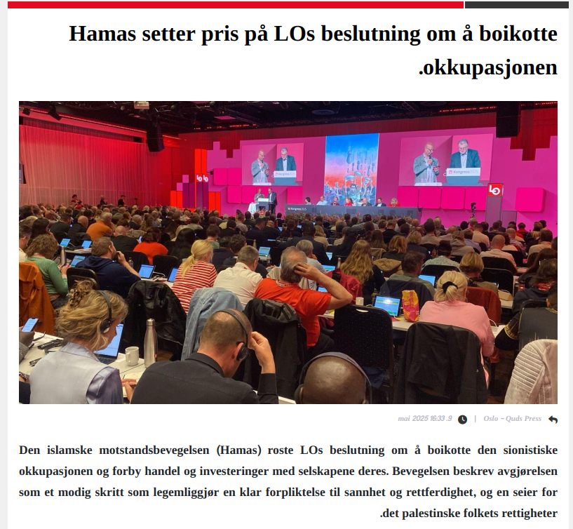 På Hamas’ egne nettsider, Quds Press, står det ofte om norske forhold. Særlig underlig er det ikke, da terrorgruppen anser Norge som en viktig alliert i kampen mot jødene. Norge har i en årrekke sendt fagforeningsdelegater for å lære opp terrorgruppenes medlemmer, det finner man på PFLPs egne nettsider.