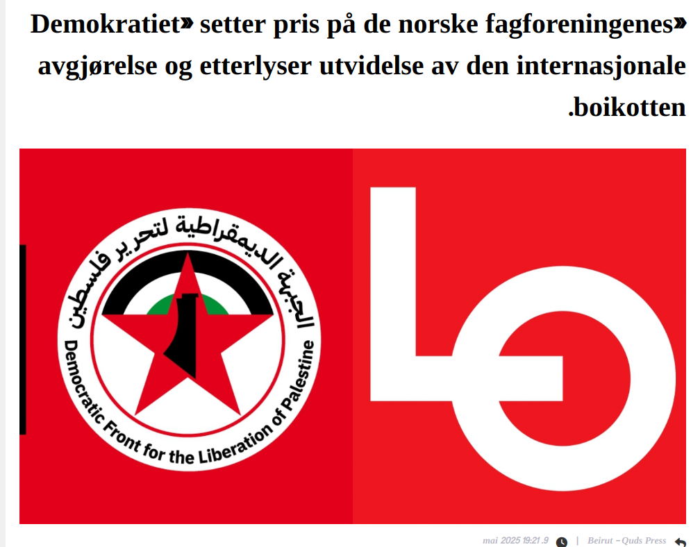 Den demokratiske fronten for frigjøring av Palestina, DFLP, som er en marxist-leninistisk utbryterfraksjon av PFLP og del av PLO, var også svært fornøyde med norske LO, og «uttrykte sin dype takknemlighet for den historiske resolusjonen fra den norske fagforenings generalkonferanse», som det heter på Quds Press, illustrert på denne måten: