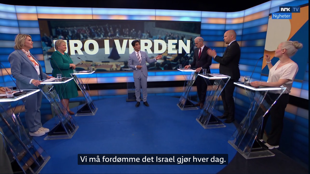 Man kunne enkelt registrere hvordan det ser ut i gårdagens Debatten på NRK, der en samlet politikerstand fra høyre til venstre side mener det er riktig å sanksjonere det eneste demokratiet i Midtøsten. Sylvi Listhaug påpekte at Israel er et demokrati som har fiender på alle kanter og at Hamas er en terrororganisasjon som kunne stoppet krigen ved å legge ned våpnene, men i det ekstreme konsensuset om at landet under Netanyahu går for langt, ble selv Frp-lederen stående å nikke til stemmene som ropte om «folkemord» og «gjøre mer» og «brudd på folkeretten», og viljen til å trekke norske investeringer ut av det påståtte «folkemordet» var kollektiv.