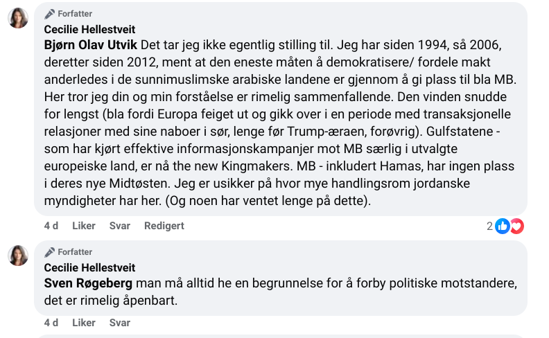 Umiddelbart kan man anta at det er et uttrykk for at det er bra at Brorskapet blir forbudt, men tvert om mener Hellestveit at det ikke er greit i det hele tatt. Hun vil ha både Brorskapet og Hamas som aktører i regionen, presiserer hun selv et stykke ned i tråden. Det hun «ikke tar stilling til» er Bjørn Olav Utviks spørsmål «så hva skulle være legitime grunner for å forby MB?».