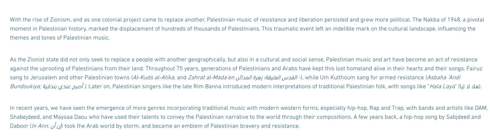 I Wikipedia-artikkelen Music of Palestine kan man tilsvarende lese at «Palestinske krigssanger har fremtredende referanser til motstand mot okkupasjonen av Palestina, oppfordrer palestinere til å kjempe mot okkupasjonen og bli værende i sitt land, og beskriver historiske hendelser.»