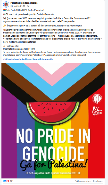 Palestinakomiteen i Norge, i samarbeid med organisasjonen Salam, annonserer sin deltakelse i Oslo Pride 2025 med parolen «No Pride in Genocide» og inviterer til en paradeseksjon som kombinerer støtte til Palestina-saken med skeiv aktivisme. Arrangementet, som ifølge komiteen samlet over 5.000 deltakere i 2024, har som mål å være en «kraftfull stemme» mot det de beskriver som Israels okkupasjon, apartheid og folkemord.