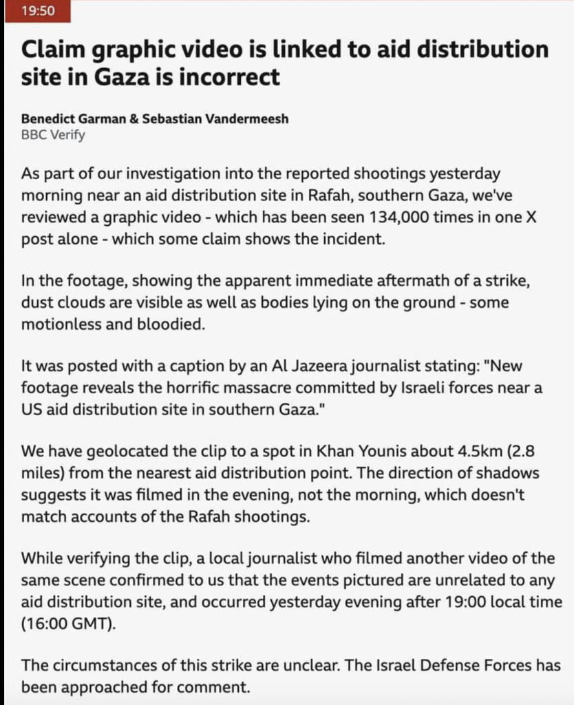 Så sent som i går slo MSM fast at israelske styrker skjøt og drepte uskyldige sivile palestinere som sto i nødhjelpskø, mange med kildehenvisning til en artikkel i Times of Israel – der det slett ikke var belegg for hva MSM hevdet. Et videoopptak fra Gaza med sårede og drepte palestinere sirkulerte også, men der blant annet BBC i går kveld slo fast at videoen ikke var fra distribusjon av nødhjelp, slik som det ble hevdet: