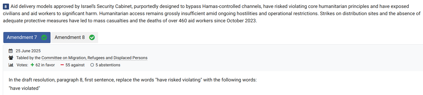 Oversettelsen til norsk gir den opprinnelige ordlyden: «Modeller for bistandslevering godkjent av Israels sikkerhetskabinett, angivelig utformet for å omgå Hamas-kontrollerte kanaler, har risikert å bryte med sentrale humanitære prinsipper og har utsatt sivile og hjelpearbeidere for betydelig skade. Humanitær tilgang er fortsatt grovt utilstrekkelig på grunn av pågående fiendtligheter og operasjonelle restriksjoner. Angrep på distribusjonssteder og mangel på tilstrekkelige beskyttelsestiltak har ført til masseskader og dødsfall for over 460 hjelpearbeidere siden oktober 2023.»