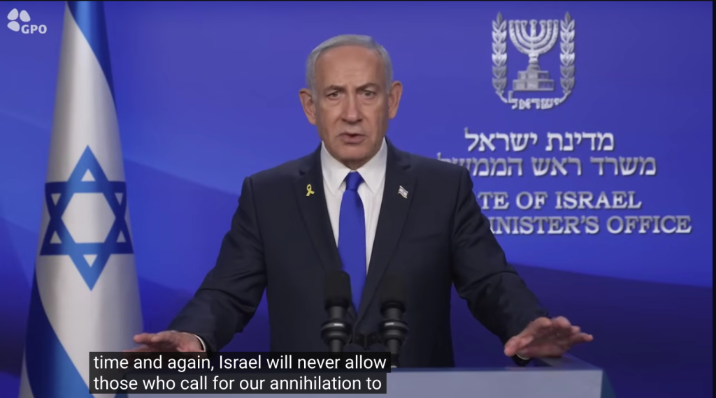 Han trakk paralleller til Holocaust og understreket at Israel ikke ville tillate å bli «offer for et kjernefysisk holocaust» fra Iran. Netanyahu presenterte operasjonen som et forsvar ikke bare for Israel, men også for regionens arabiske naboer og den «siviliserte verden», og fortalte at Iran planla å utstyre sine terrorproxyer med kjernefysiske våpen. Han takket også USAs president Donald Trump for støtten, selv om USA ikke var direkte involvert i angrepet.