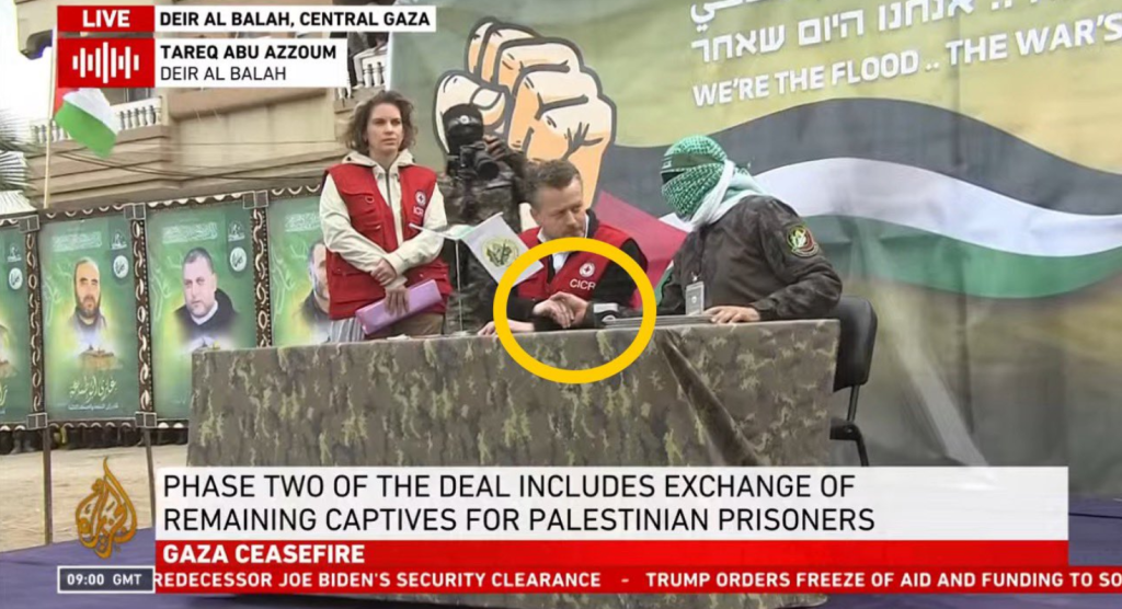 Den mest sjokkerende scenen hittil utspilte seg for to helger siden, da Hamas-militante tvang tre sterkt underernærte israelske fanger – Ohad Ben Ami (56), Eli Sharabi (52) og Or Levy (34) – til å holde en tale til en folkemengde i Gaza før de ble løslatt. Ved siden av de maskerte væpnede mennene sto to Røde Kors-tjenestemenn, identifisert av Washington Free Beacon som Nour Khadam og Stephanie Eller, begge omtalt i ICRC’s nettmateriale.
