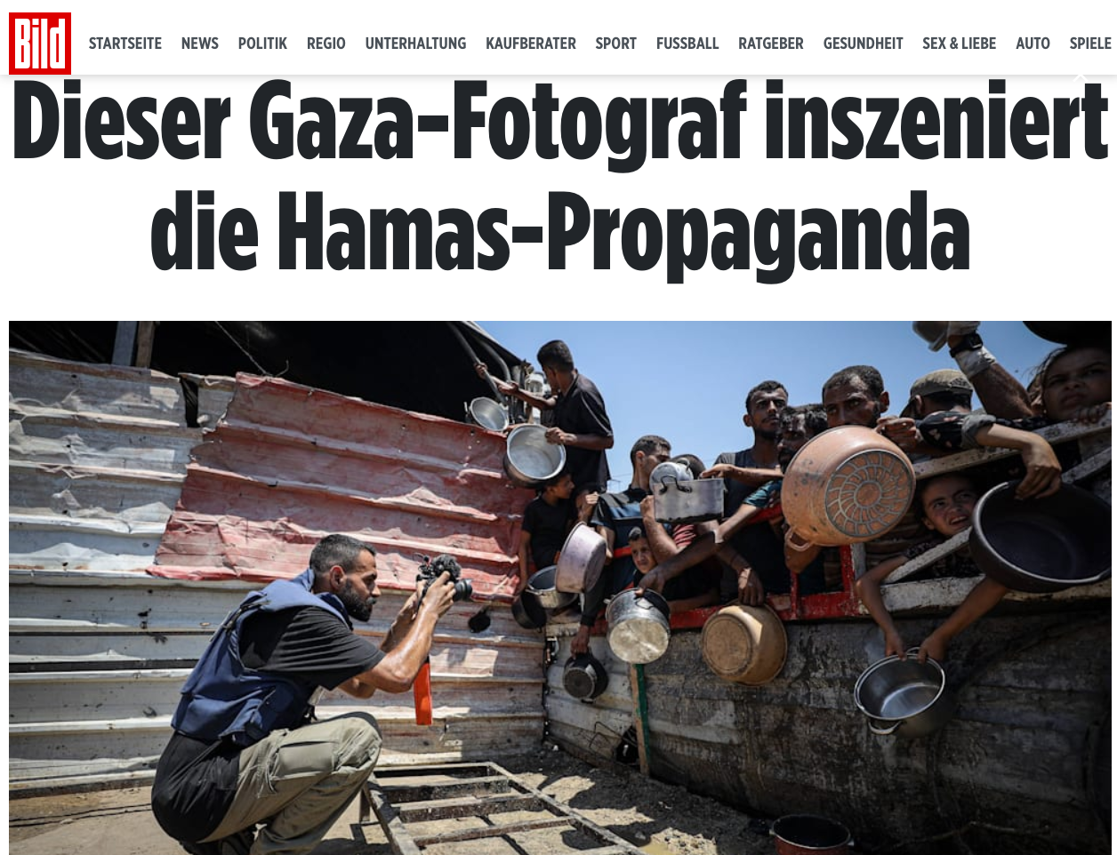 Tyske Süddeutsche Zeitung og Bild gikk tidligere denne måneden ut med en omfattende og veldokumentert rapport om hvordan Hamas har regien på pressebildene som tilsynelatende dokumenterer virkeligheten på Gaza. Noen bilder er ikke engang fra Gaza, mens andre viser barn som lider av kroniske sykdommer som ikke er relatert til krigen. Et bilde innhentet av avisen viste fotografer som instruerer gazanere til å posere som om de står i kø for mat.