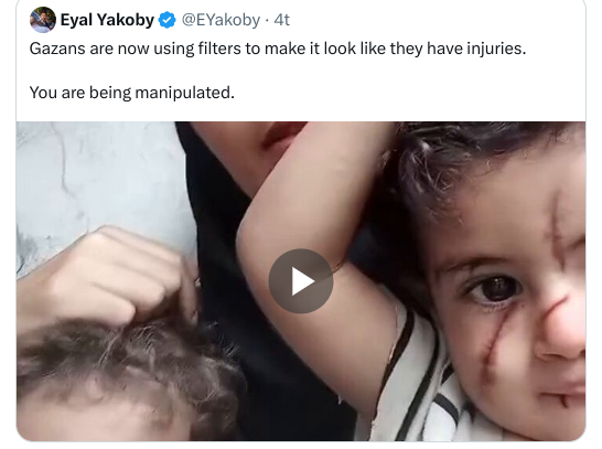 I sosiale medier florerer bildene, følelsesmanipulerende bilder, ekte bilder og falske bilder og iscenesatte bilder publiseres i et voldsomt tempo, der det umiddelbart kan være vanskelig å vite hvilke bilder som viser realiteter og hvilke bilder som er manipulert. Det finnes sågar apper man kan bruke for å manipulere bilder selv – og de brukes. X-posten vi har bilde av her viser et lite barn med tydelige skader i ansiktet. Trykker du på denne lenken kan du se hvordan appen fungerer, og hvordan den noen ganger glipper, slik at det er mulig å avdekke manipulasjonen. Barnet er i realiteten uskadd. Sårskadene er et filter som legges på når man bruker appen.