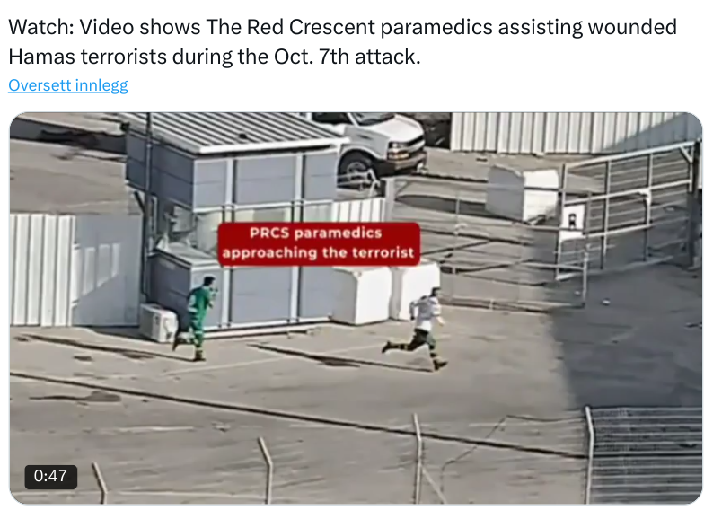 Og joda, humanitære er de jo på sett og vis. Man kan eksempelvis se denne videoen fra 7. oktober 2023, der ansatte i Røde Halvmåne kommer løpende til for å hjelpe en terrorist som har skadet seg.