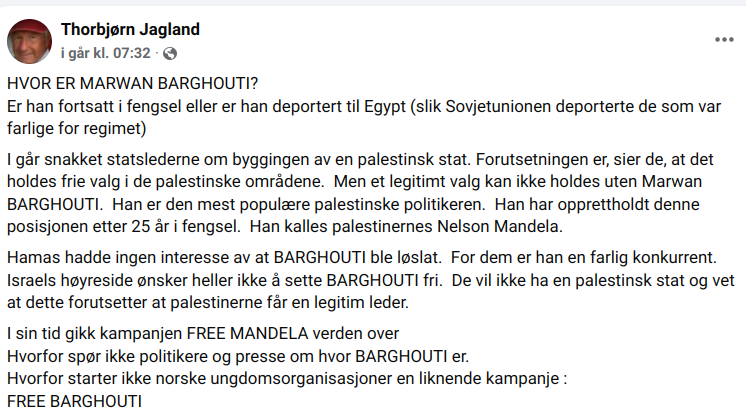 Den gamle Palestina-traveren Thorbjørn Jagland, tidligere statsminister med visjonen «Det norske hus», fadesen med krav om 36,9 prosent oppslutning under valget i ’97 og utenriksminister i den første regjeringen til Jens Stoltenberg, er Norges fremste talsperson for Barghouti. Gjentatte ganger har Ap-veteranen tatt til orde for frigivelse av Barghouti, og etter Trumps fredsforhandlinger mellom Israel og Hamas, har han fortsatt. Senest i går postet han på Facebook: