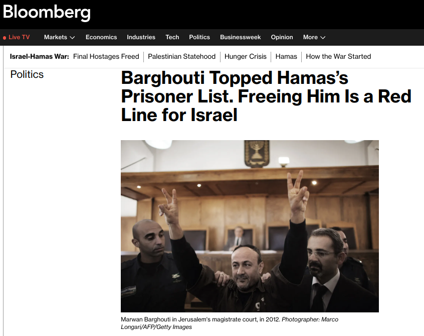 Hvor Barghouti er, er enkelt å besvare. Han er i israelsk fangenskap. Hvor villedende Jaglands framstilling er forøvrig, kan kanskje best illustreres ved å se på påstanden om at «Hamas hadde ingen interesse av at Barghouti ble løslatt.» Det er direkte usant. Enhver som følger utviklingen i Midtøsten vet at Barghouti toppet kravlisten Hamas la fram under forhandlingene i Sharm el-Sheik. Kravet fikk sågar stor medieoppmerksomhet i land vi burde kunne sammenlikne oss med, mens det var stille her i Norge. Faksimilen fra Bloomberg sier sitt: