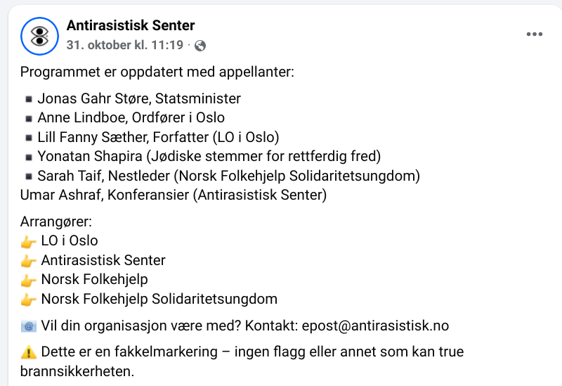 Bit spesielt merke i den siste kommentaren i Antirasistisk Senters Facebook-oppdatering om arrangementet. «Ingen flagg» som kan «true brannsikkerheten». Det er så man ikke tror det man leser. Dette er da skrevet av en organisasjon som har brukt palestinaflagget som aktiv markør helt siden krigen brøt ut. Den radikale Sofia Rana fra Rødt, som har vært tilknyttet Antirasistisk Senter, har kommet med en rekke oppfordringer til å intensivere motstanden.