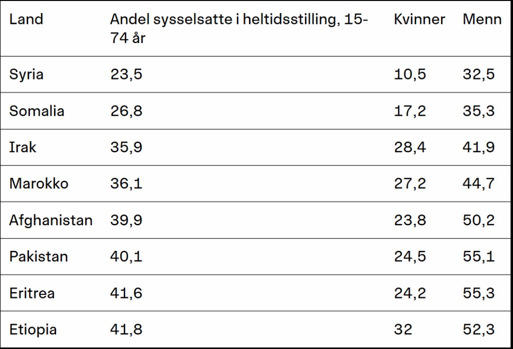 Etiopiere, som kommer fra et land der i overkant av 30 prosent er muslimer, mens resten stort sett er kristne av ulike avskygninger, gjør det best på statistikken, med en av tre kvinner i full jobb, og over halvparten av mennene. Også eritreere gjør det bedre enn syrere og somaliere. De kommer fra et land der ca. halvparten er muslimer, den andre halvparten kristne.
