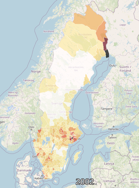 Man kan selv gå inn på kartet her, og sette pekeren på de ulike årstallene, og slik se hvordan Sverige har gått gjennom en demografisk transformasjon i 20-årsperioden. Tallene er hentet hos det svenske SSB (SCB), så de bør være riktige. Dess mørkere farge på et område, dess færre svensker bor der. Ved å trykke seg inn på de markerte områdene, kan man se den konkrete utviklingen i tall. Malmø er for lengst dominert av innvandrere, Gøteborg blir det i løpet av et par år ut fra den observerbare utviklingen. I Haninge, Sødertälje, Botkyrka, Huddinge, Sundbyberg, Sollentuna, Järfälla, Västby, Upplands-Bro med mange flere, er svenskene i mindretall i eget land allerede i dag.