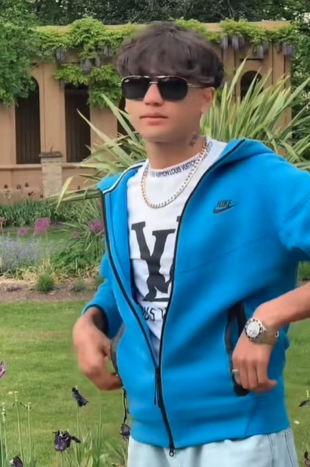 Foto fra TikTok hvor Jahanzeb poserer med merkeklær, smykker og tatovering under sin reise gjennom Europa