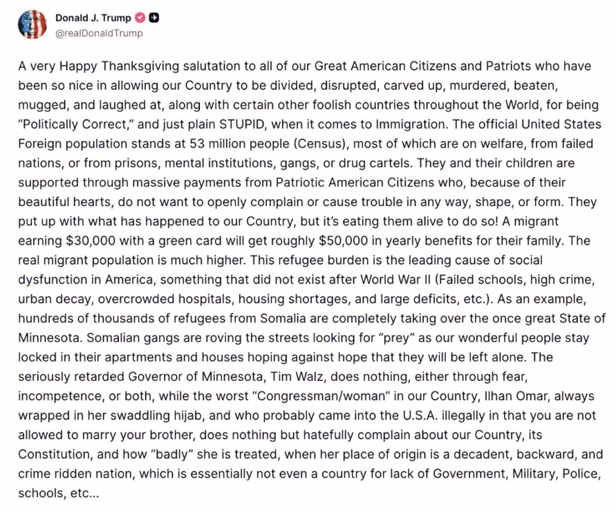 Det er overnevnte som har fått Trump til å sette foten ned for innvandring fra hele 19 land, utløst av at en afghaner som skjøt to nasjonalgardister nær Det hvite hus, hvorav den ene døde. Fokuset hans under annonseringen var somaliere i USA: