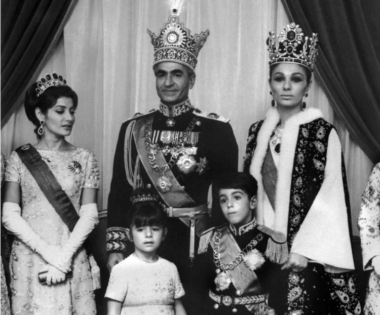 Den iranske sjahfamilien i 1967 under kroningen av Mohammed Reza Pahlavi, den siste sjahen av Iran. Sønnen Reza Pahlavi står mellom far og mor. Under den iranske revolusjonen i 1979 ble sjahens styre avsatt. Foto: Ukjent