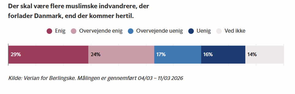 Den ferske meningsmåling utført av Verian for Berlingske, tar utgangspunkt i krav fra Dansk Folkeparti ved partileder Morten Messerschmidt. Målingen spør danskene om de er enige i at det bør være flere muslimske innvandrere som forlater Danmark enn som kommer hit.