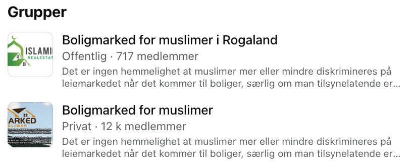 Ett enkelt søk på Facebook viser at samme praksis er etablert i Norge. Da selvsagt under dekke av at muslimer «diskrimineres på leiemarkedet», som om det er stemplet muslim i panna på dem.