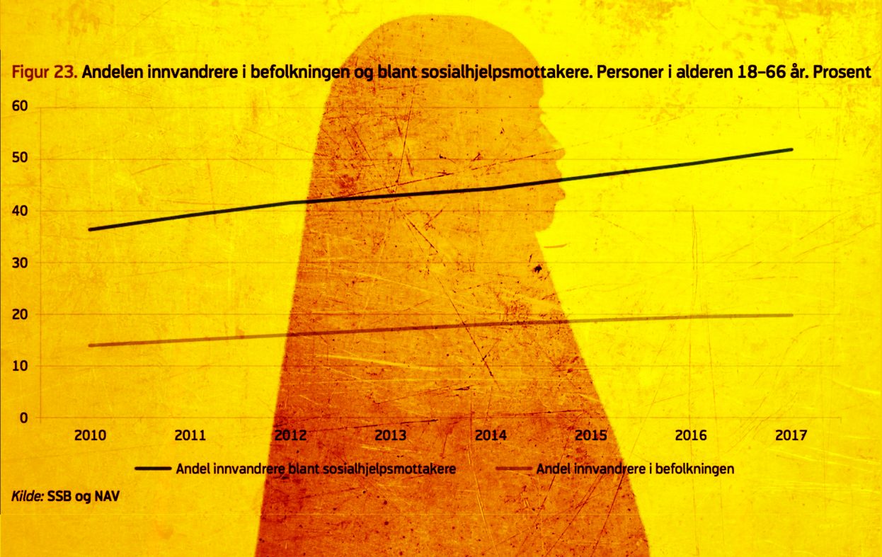 Over halvparten av sosialhjelpsutbetalingene går til innvandrere, der folk fra Asia og Afrika er overrepresentert. Innvandrere utgjør en stadig større andel av dem som mottar sosialhjelp, og de mottar mer penger enn andre sosialhjelpsmottakere. Men legge om innvandringspolitikken? Nei, mer av det som ikke fungerer, synes å være politikernes holdning.