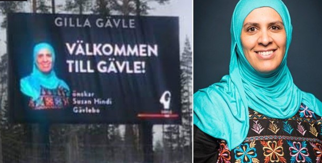 På et reklameskilt utenfor byen Gävle ønskes besøkende velkommen av en kvinne i hijab. Og kvinnen er ikke hvem som helst. Hun har åpne bånd til den ekstreme moskeen i Gävle, der imamen anses å være lederen for militante islamister i Sverige. Imamen hyller Den islamske staten og Al-Qaida.